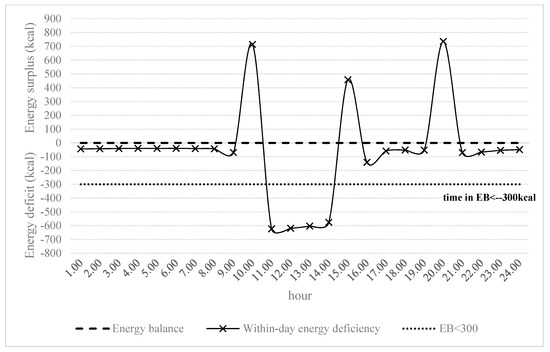 For all participants, we calculated WDEBneg, which is time spent in negative energy balance, and WDEB−300, which is time spend in energy balance under −300 kcal. EA was calculated as EA = (EI − EEE)/FFM. An example of WDEBneg and WDEB−300 calculation can be seen in Figure 1.