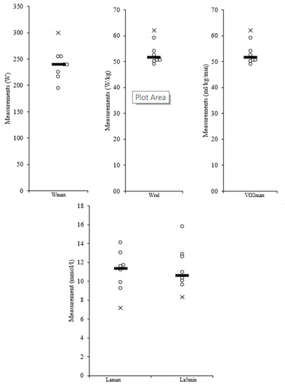Scatter plots for performance-related parameters Wmax, Wrel, VO2max, Lamax, and La5min. The x is the value of the participant excluded from further analysis for performance parameters.