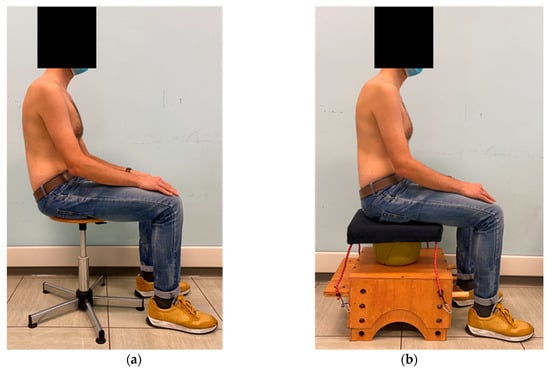 Back pain is a leading cause of disability and a main contributor of disease burden worldwide [,]. Non-specific back pain (also called mechanical back pain) is the most common clinical presentation of back pain and refers to conditions without a known etiology [,]. Back pain is a complex condition that results from the interaction of multiple factors including physical issues (e.g., prolonged standing), unhealthy lifestyle (e.g., smoking and obesity), psychological factors (e.g., distress), manual tasks (e.g., heavy loads or lifting objects far from the body), awkward postures and genetic factors []. In addition, sitting issues (i.e., sitting duration, chair type, amount of spinal motion and spinal curvature during sitting) have been proposed as risk factors for the development of back pain []. The physiological sagittal spinal curvature represents a typical feature of good body posture []. As to standing, the presence of slight curves (thoracic kyphosis and lumbar lordosis) has been described as the “ideal” spinal posture on the sagittal plane [,,,,]. On the other hand, despite the definition of the best sitting posture still being the object of debate, physiotherapists deem advantageous those sitting postures that match the natural shape of the spine [,,]. One of the most common strategies used by physiotherapists for managing back pain is to provide some advice on spinal postures. In particular, addressing sitting spinal posture may help reduce symptoms of patients with back pain [,]. Dynamic chairs have been proposed to address the negative effects of prolonged sitting by increasing the effort required to maintain sitting balance, stimulating posture variation, promoting lordotic lumbar postures and decreasing lumbar muscle tension [].