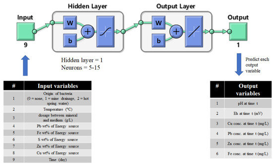 Data for ANN modeling from our previous eight studies about bioleaching were collected and organized for input variables and output variables. If all factors were used as input variables, the amount of data required for learning the ANN model would be enormous. Therefore, factors that are considered important were selected as input variables. Among the various characteristics of microorganisms, the origin of bacteria was selected as an input variable because it was considered that it would have the greatest impact. Our previous studies have confirmed that temperature and dosage between mineral and medium have a great effect on bioleaching. Therefore, temperature and dosage were also selected as input variables. In addition, the preference of microorganisms will vary depending on the composition of minerals and the bioleaching tendency will vary significantly, thus the ratio of each mineral corresponding to the formation of minerals was selected as input variables. Finally, in this study, we selected time as an input variable because we wanted to predict the bioleaching over time through ANN model. For those reasons, nine factors were selected as input variables: origin of microorganisms (none = 0, mine drainage = 1, hot spring water = 2), temperature (°C), dosage between solution and mineral (g/L), Pb percent ratio of mineral, Fe percent ratio of mineral, S percent ratio of mineral, Zn percent ratio of mineral, Cu percent ratio of mineral, and bioleaching time (day). When normalizing input values, the relative effects of each factor can be examined. However, in this study, it was difficult to average the inputs used, such as the origin of bacteria and bioleaching time, as in other inputs. Therefore, in this study, these values were used directly without averaging. As output variables, pH, Eh, Cu concentration of leachate at specific bioleaching time, Pb concentration of leachate at specific bioleaching time, Zn concentration of leachate at specific bioleaching time, and Fe concentration of leachate at specific bioleaching time were selected. Since the observed output variables in each study are different, the data used for ANN modeling in each study are organized in Table 2. All input and output variables are not normalized. In the case of input variables, normalization was not carried out due to the existence of variables that could not be normalized based on the minimum–maximum value due to the different characteristics of each variable. In the case of output variables, a maximum value of the concentration of heavy metal ions continuously leaking cannot be set, so it is not normalized.