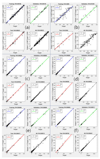 Table 3 presents the MSE and R value for each topology for each output variable. Regardless of the type of output variable, the optimal topology was when the neurons in the hidden layer were greater than 8, probably because many neurons under the same hidden layer structure can include small cases. However, there was no optimal case with the largest number of neurons, apparently due to the increasing number of neurons in the model’s optimization process making it more difficult to find the optimal w and b matrices. Table 4 presents the values of weights and biases for each layer and neuron from the best topology for each output variable. The diagnostic plots between observed and predicted values in the ANN model are illustrated in Figure 2, which shows a high correlation coefficient (R) value.