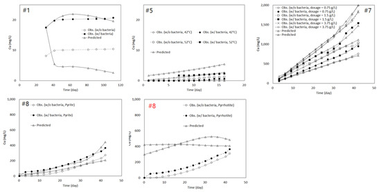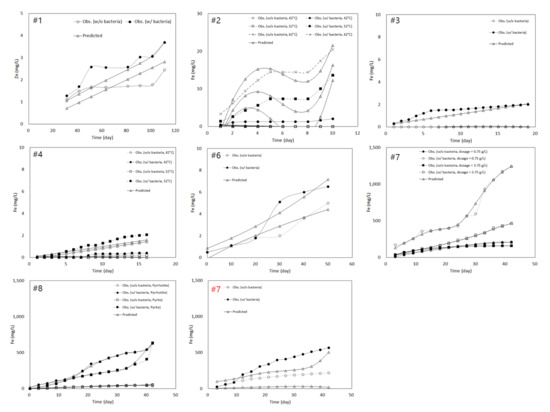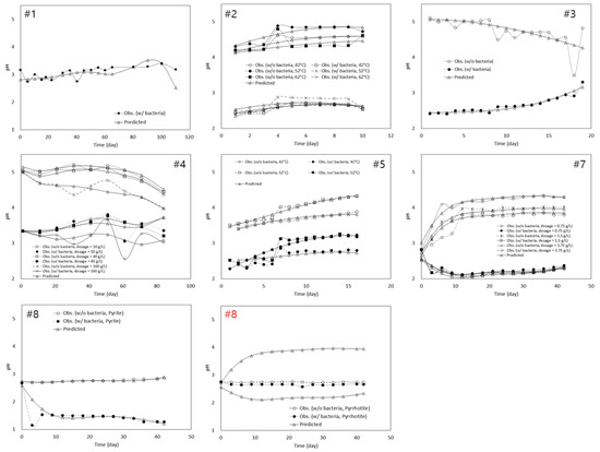 The Eh results and the prediction by ANN model are shown in Figure 4. The X-axes are diverse depending on experimental conditions. Similar to the pH results, Eh also has similar levels of value, so it can be seen that overall predictions are good. Eh also showed a big difference in trends, as with pH, depending on the presence or absence of bacteria. The effect of temperature and dose was also smaller, similar to the pH result. For further verification, the only difference is in the dosage compared to Experimental Condition #4. Although the difference between the dosage is not significant in the corresponding results, it is judged that the effect of the dosage was greater for the ANN model. In the case of the Eh model, it is expected that the more sophisticated ANN model will be obtained by performing additional experiments involving various dosage conditions and applying the results to the training.