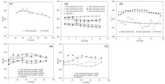 Predicting the results from the data for further verification was also performed to examine the predictability of the developed ANN models. The pH results and the prediction by ANN model are shown in Figure 3. The X-axes are diverse depending on experimental conditions. In the case of pH, the range of values does not vary much by studies, while, in the case of bacteria, the lower tendency is universal. Therefore, the presence or absence of bacteria has the greatest influence. Temperature and dosage were found to have relatively little effect on pH changes. For this reason, the prediction of the ANN model was similar to the actual results, regardless of the experimental conditions. However, the results from further verification were less predictable. In other words, it was predicted that the pH would be lower if bacteria existed, but, in reality, there was no significant difference depending on the presence or absence of bacteria in these conditions. This prediction is due to the fact that most of the data used in ANN model optimization are cases where pH varies greatly depending on the presence or absence of bacteria. Because there are no learning data under conditions where pH does not change much, it is difficult to predict the results under conditions that do not change much. Therefore, it is necessary to conduct additional experiments under conditions where the presence or absence of bacteria does not significantly affect pH and use them for the advanced ANN model.