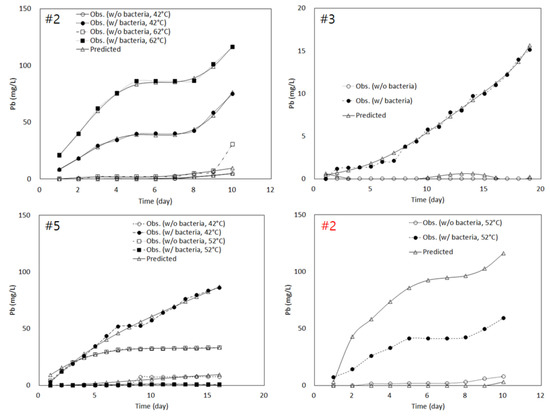 The Pb concentration results and the prediction by ANN model are shown in Figure 6. Unlike the results in copper, Pb does not increase leaching as the content of Pb increases. Compared to Condition #2, the amount of elution was lower despite the high Pb content of Condition #3. We could also confirm that the minerals of Conditions #5 and #3 are the same, but the leaching of Condition #5 is much greater. For the Pb concentration data, the degree of value varies, but there are few data, so it seems to fit well regardless of the conditions. The results of Condition #2 suggest that elution increases as the temperature rises from 42 to 62 °C. For this reason, under the additional experimental conditions of 52 °C conditions, similar to those of Condition #2, the ANN model was determined to have leaching between 42 and 62 °C. However, the actual results are similar to those at 42 °C. In other words, the effect of temperature is not linear, so it is necessary to look further at the effect of temperature.