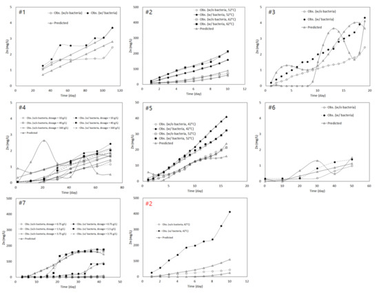 The Zn concentration results and the prediction by ANN model are shown in Figure 7. In the case of Zn, the higher is the content of Zn in the mineral, the more likely it is to be leached. However, while Condition #2 had the highest Zn content and the highest leaching, Condition #7 tended to have higher leaching, even though Conditions #3 and 5 had less Zn content. The effects of temperature and dosage showed a tendency similar to other heavy metals. Similar to Cu concentration, the higher is the concentration, the more accurate is the prediction. In addition, ANN predictions tend to fluctuate at low concentrations, which seems to be the result of minimizing MSE since ANN is not a gradually enhanced model. To overcome these shortcomings, it is necessary to optimize the model by utilizing the structure of the ANN model in the form of Recurrent Neural Network (RNN) or by taking logs at the concentration of Zn. The forecast for the additional experiment was much lower than the actual value, which appears to be similar to Pb because it does not reflect actual measurements that are not linearly affected by temperature.