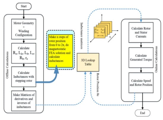 All inductances and resistances need to be calculated with stepping rotor and save them in 3D lookup tables where the third dimension corresponds to the rotor position as shown in Figure 1. All calculations can be done in offline environment using a magneto-static FEM solution and in the online environment the rotor position can be used as an index value to call a corresponding matrix from the lookup table to calculate the performance parameters like speed and torque, etc.