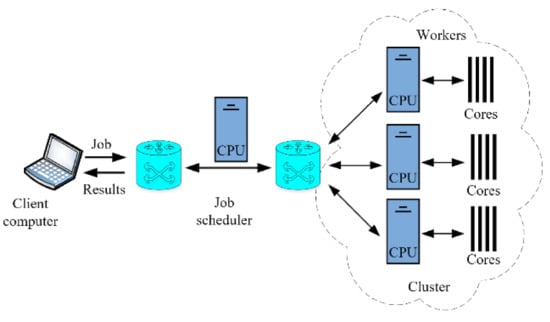 Parallel computing is a form of concurrent computing where several workouts can be performed in the overlapping periods. Generally, any large problem can be divided into n-small problems, which can be solved simultaneously. Unlike traditional serial programs, the divided problem segments should be independent of each other so that they can run on different processors and the solutions can be combined on the client machine at the end. The general schematic diagram of distributed parallel computation is shown in Figure 2. The client machines, job scheduler, WIFI or LAN network, and the worker processors, are the main parts of the distributed cloud computation. The function of the job scheduler is to divide and distribute the segments of the bigger problem into cluster computers. The cluster computers can further divide their portion among their cores in the same manner.