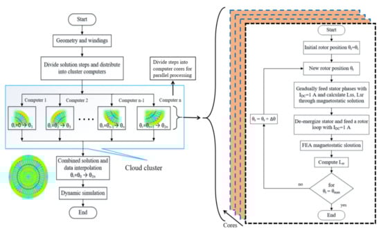 Figure 3 shows the required steps to calculate the inductances at different rotor positions. The computer cluster consists of four computers making a local area network (LAN). Each computer is Intel(R) Core(TM) i7-7500 CPU @ 3.41 GHz with 8 GB RAM and four cores. The finite element method (FEM) based model is constructed using open-access software FEMM 4.0. For making the model and collecting the results, FEMM is interfaced with MATLAB. After making the machine geometry and winding configuration on FEMM, MATLAB works as a job scheduler. It divides the total number of rotor steps among worker computers and their cores and receives the end results.