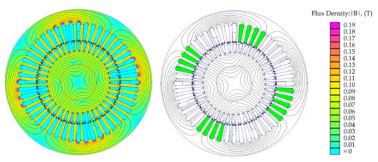 where A is the vector potential, J is the current density, n is the number of turns per phase, i is the phase current, the subscript “si” is for surface integral. The first bracket term in Equation (16) is the integration of the vector potential of coils with positive current or the coils pointing out of the page. The second term corresponds to the coils with negative current or pointing into the page, a2 is the cross-sectional area of the coil, which is approximately equal to the slot area multiplied with the filling factor. The motor’s magnetic flux distribution after the energizing phase “a” with 1 A DC current is shown in Figure 4. The highlighted slots contain phase “a” winding whose surface integral of magnetic potential is equal to self-inductance Laa at the specific rotor position as in Equation (15).