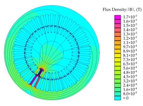 Similarly, all stator–stator self and mutual and stator–rotor mutual inductances can be calculated. The rotor–rotor self and mutual inductances are calculated by energizing a single rotor loop with unity DC current as shown in Figure 5. Only one rotor loop needs to be energized and solved for its inductances, and the rest of them possess the same solution with a phase shift equal to the angle difference between them.