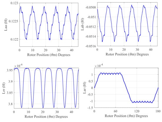 where Vs, Is, Ir, Rs, Rr, Lss, Lsr, and Lrr are the vectors containing the machine’s voltage, currents, resistances, and inductances respectively. The stator–stator, stator–rotor, rotor–stator, and rotor-–rotor self and mutual inductance matrices (Lss, Lsr, Lrs, and Lrr) can be defined as follows;