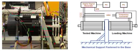 The test rig consists of two identical motors with specifications given in Table 1. Both machines are attached back to back on the same mechanical foundation as shown in Figure 7. The first motor is the test motor while the second acts as a loading machine. The grid supplies the test machine while the loading motor is controlled using ABB ACS-880 industrial inverter for better controllability of slip. The measurement time of the stator current of the test machine under healthy and broken bar cases is 100 sec with a sampling frequency of 10 kHz.