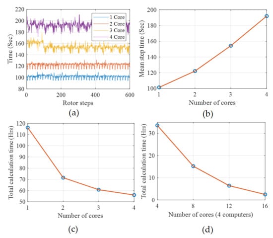The overall computational speed of each worker (computer) can be increased by using all cores in a parallel fashion. This increase in speed is because of increased cache, which reduces memory latency; the parallel handling of the independent instructions; and the improved performance of the processor power wall. The per-step computational time for the calculation of inductances relevant to a single phase (Laa, Lab, Lac, and Lar) at different rotor positions by using the different number of cores is shown in Figure 10a. Since, with the increase in the number of cores, more processing power is being utilized, the per-step calculation time increases. Moreover, the variation in the calculation time with the increase in the number of cores also increases, which depends upon the processor being utilized by auxiliary programs like Windows, etc. Figure 10b shows the mean per-step simulation time, which increases from 100 to 200 s per step with the increase in the utilization of processing power from about 25% (one core) to 94% (four cores). The mean simulation time is calculated because each step takes a slightly different time for calculation because of the change in the number of mesh elements and the other programs running in parallel. The overall calculation time for all inductances for 1920 rotor positions is shown in Figure 10c. It is obvious that even the per step simulation time with an increase in the parallel processing increases, but the total calculation time decreases dramatically. Meanwhile, Figure 10d shows the time taken by the cluster of four computers working as a LAN. The simulation time decreases considerably and the non-linear decrease in time is due to the latency of the network. It is worth mentioning that the job scheduler prefers cores of different computers to work in parallel. This is the reason why the computational time in Figure 10d with four cores of different computers working in parallel is considerably less than the time taken by one computer with all four cores engaged in parallel as shown in Figure 10c.
