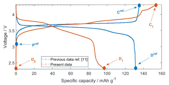 Before the operando experiment, the cell was subjected to an anomalous cycle test, consisting of five cycles with current density set at ±10 A gMnHCF−1 (i.e., 67 C), to simulate BMS malfunctioning and ill-usage of the device, followed by a discharge with current density equal to −0.1 A gMnHCF−1 (see Figure S1) [11,12].