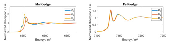 Spectra at the Mn and Fe K-edges for D0, C1, and D1 states of charge.
