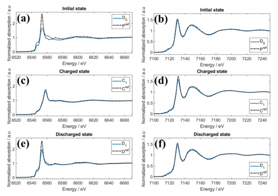 Spectra at Mn and Fe K-edges for the initial, charged, and discharged states of charge. Each panel illustrates the comparison of the spectra recorded in the previous work and the ones reported in Reference [11]. The Mn K-edge for the initial, charged, and discharged states is displayed in panels (a), (c), and (e), respectively, while the analog series at the Fe K-edge is displayed in panels (b,d,f).