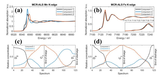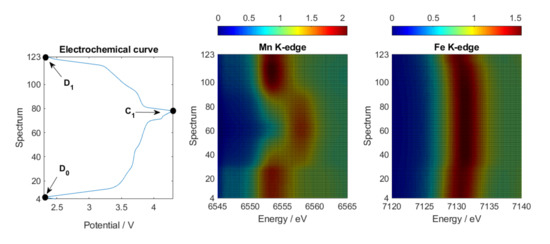 The operando dataset recorded during charge (from spectrum 4 ≡ D0 to spectrum 64 ≡ C1) and discharge (from spectrum 65 to spectrum 123 ≡ D1) at the Mn and Fe K-edges is presented in Figure 4. The results point out: (1) the high variability of the Mn K-edge and low modification at the Fe K-edge; (2) the energy shift occurring at both Mn and Fe sites during charge (shift towards higher energies up to C1 state of charge) and discharge (shift towards lower energies up to D1 state of charge). The large dataset acquired at both edges was analyzed with the MCR-ALS chemometric approach, revealing the three pure spectral components necessary to describe the electrochemical cycling processes in the present case study and the concentration profile plot for each component.