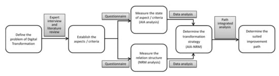 This section proposes the model of digital transformation strategies based on the AIA-NRM for the Med-Tech enterprises. This study defines the critical decision problem of digital transformation for the Med-Tech enterprise, and then identifies the aspects/criteria that influence the driving factor of digital transformation by the expert interviews and literature review. In the second stage, the study measures the acquisition and importance for each aspect/criterion based, on the AIA (acquisition–importance analysis) approach. We also determined the influence relation structure of the digital transformation through the NRM (network relation map) approach. Then, the study integrated the AIA (acquisition–importance analysis) approach and NRM approach to propose the AIA-NRM (acquisition–importance analysis and network relation map) approach for digital transformation of the Med-Tech industry.
