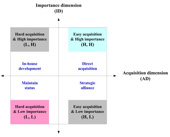 The aspect of RS and PC was located in the second quadrant (L, H), indicating that the aspect of RS and PC were characterized by low AI and high II. Hence, the Med-Tech businesses consider that the aspect of RS and PC are hard acquisitions and of high importance for the digital transformation. Although the Med-Tech businesses do not consider the acquisition as easy, the RS aspect and PC aspect, but the aspects of RS and PC are the critical and important aspects, the Med-Tech businesses should consider developing the professional competence and establish the regulatory system through in-house development. Therefore, the development strategy of in-house development should be applied in the second quadrant. The aspects of CR and ME were located in the third quadrant (L, L), indicating that the aspects of CR and ME were characterized by a low AI and a low II. Hence, the Med-Tech businesses consider that the aspects of CR and ME are hard acquisition and of low importance for the digital transformation. Although the Med-Tech enterprises consider critical resources and market expansion ability are hard to acquire, but the CR aspect and ME aspect still do not involve the critical and important aspects, and the Med-Tech enterprises can maintain the current status. Therefore, the development strategy of maintaining the status quo can be applied in the third quadrant.