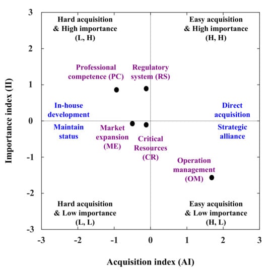 The axes on the competency position map include the AI and the II. The AI evaluates the acquisition level from the Med-Tech business viewpoint, while the II shows the importance level for the Med-Tech business. As shown in Figure 2, the x-axis is the Acquisition Dimension (AD), and the y-axis is the Importance Dimension (ID). In this study, the digital transformation strategies for the Med-Tech industry include five aspects, PC, OM, CR, RS, and ME.