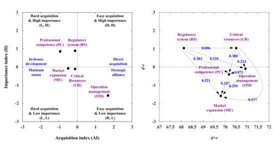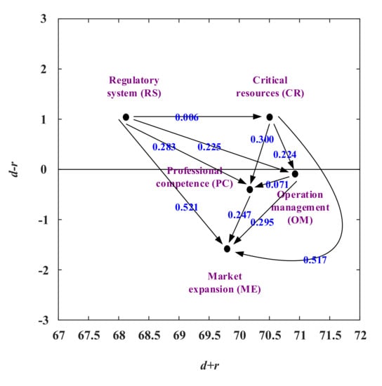 The diagonal items of the matrix are all 0. In other words, the matrix contains a strictly upper triangular matrix and a strictly lower triangular matrix. Moreover, while values of the strictly upper and strictly lower triangular matrix are the same, their symbols are opposite. This property helps us; we only have to choose one of the strictly triangular matrices. Table 8 shows the full influence matrix, and Equation (9) can produce the net influence matrix shown in Table 10. Using the values of () and () in Table 9 as X and Y values, respectively, the NRM (Network relation map) approach can be drawn as shown in Figure 4 []. Figure 4 shows that RS (regulatory system) and CR (critical resources) aspects are the primary aspect with net influence, while ME (market expansion) aspect is the primary aspect being influenced. The OM (operation management) aspect is the aspect with the highest full influence, while the RS (regulatory system) is the one with the smallest full influence aspect.