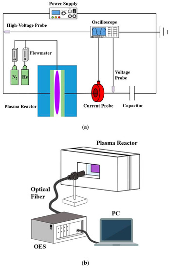 The schematic diagrams of (a) the experimental configuration; (b) the measurement of the emission spectrum with an optical emission spectrometer (OES).