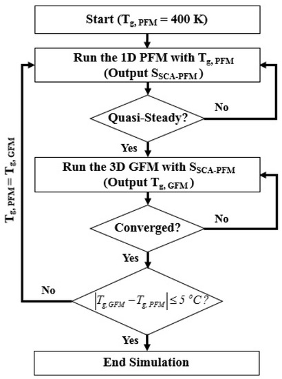 The 1D PFM and 3D GFM are developed to model the discharge dynamics and gas temperature of the reactor separately and combined with the weak coupling as shown in Figure 3 since it is efficient to obtain the individual solution separately for two models with different characteristic times [34]. The simulation is performed from the 1D PFM by adopting the initial gas temperature Tg,PFM as 400 K until the quasi-steady solution is obtained. The cyclic average power consumption and average volumetric heating source are monitored as the criteria of the quasi-steady solution and are written as: