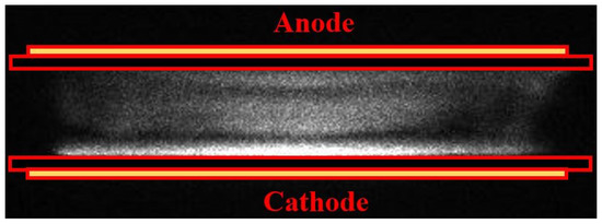 In this work, the APHeDBD is simplified with the 1D PFM under the assumption of uniform discharge. However, it is noted that APHeDBDs may not be uniform under various operating conditions [17,18]. The discharge uniformity under current operating conditions is confirmed by the ICCD photograph taken during the breakdown of a typical cycle with the 1 μs exposure time as shown in Figure 4. The uniform discharge irradiation occurs near the surface of the glass plate covering the grounded electrode due to excited species generated by energetic electrons in the cathode fall region. Uniform discharges generated in the planar reactors under similar operating conditions were reported by other groups with similar discharge structure presented [16,17], supporting the uniform discharges observed in this work. The confirmed discharge uniformity justifies the application of the 1D PFM for modeling the APHeDBDs.
