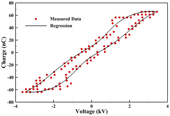 The power consumption measured is obtained by integrating the Lissajous curve measured in a typical cycle from the capacitor as shown in Figure 5. It is noted that only a few data points are plotted for presentation purposes and the solid line is regressed from measured data to calculate the power consumption. The average power consumption measured from measurements is around 2.1 W.