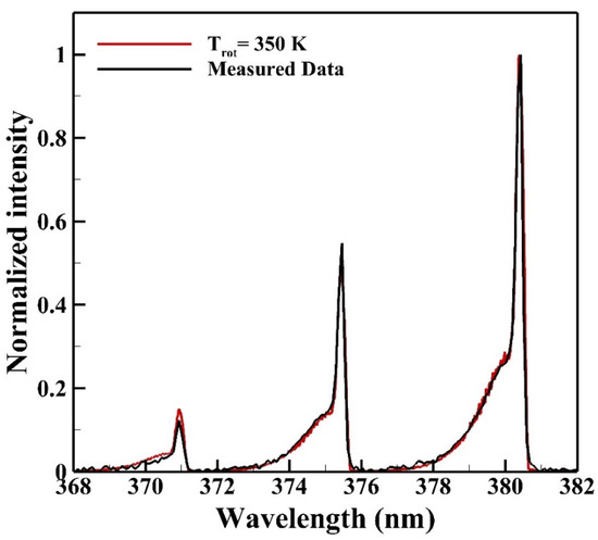 Figure 7 shows the average emission spectrum of N2 SPS measured from the reactive zone for determining the rotational temperature. The red solid line labeled as “Trot” is the theoretical spectrum calculated from the commercial software Specair with theories of quantum mechanics for comparing with the average measured emission spectrum to determine the rotational temperature. The rotational temperature determined is 350 K.