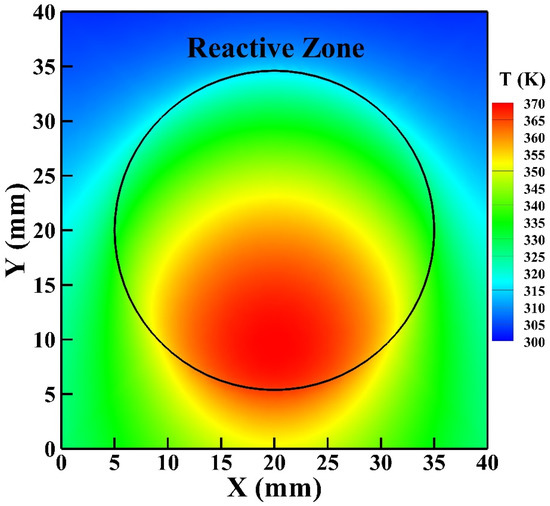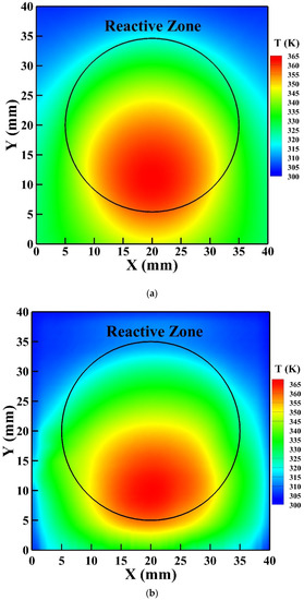 To further validate the 3D GFM developed, the simulated surface temperature of the reactor is compared with that detected by the IR thermal imager as presented in Figure 9a,b, respectively. Similarly, the high-temperature zone of the simulated surface temperature moves downward from the central region of the reactive zone as explained previously, which agrees with the temperature distribution detected by the IR thermal imager. The simulated highest surface temperature is 362 K, which is in good agreement with that detected by the IR thermal imager as 365 K with an uncertainty of 2 K.