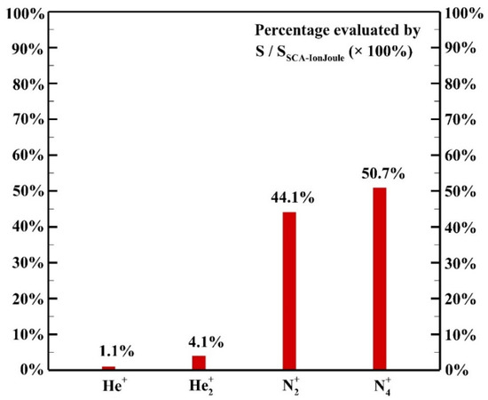 The contribution of each species to the ion Joule heating is shown in Figure 12. It is assumed that the power acquired by the ion species is transferred to background gases thoroughly due to the efficient collisions among ion species and background gases with comparable masses. Among ion species, the species N2+ and N4+ contribute 44.1% and 50.7%, respectively, to the heating source of ion Joule heating as the dominant species though the concentration of N2 is much lower than that of helium.