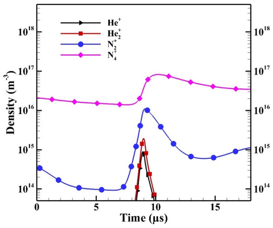 To further study the contribution of each ion species, Figure 13 shows the spatial average density changes of ion species during the breakdown in a typical positive HP. For the presentation purpose, the horizontal axis is rescaled. As the breakdown occurs, the number densities of He+ and He2+ increase simultaneously due to: