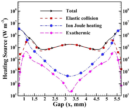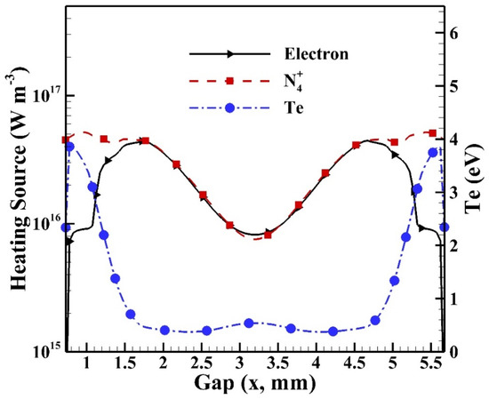 Before investigating the spatial distributions of heating sources, it is essential to understand the cyclic average spatial distributions of species densities of electrons and dominant ions as shown in Figure 14 with the distribution of electron temperature included. It is noted that the sheath regions are built near the glass surfaces (i.e., at 0.7 mm and 5.7 mm) since the intensive electric fields (not shown) are built due to the distribution of charged species. The intensive electric field that is built results in energetic electrons with high electron temperature, which leads to high reaction rates in the sheath region. Similar simulated results with sheath regions were observed for atmospheric pressure helium dielectric barrier discharges excited by kHz power sources [16,35]. It is observed that the electron temperature reaches around 3.9 eV as the maximum in the sheath region, while the density of N4+ reaches around 5.2 × 1016 m−3. Both the species densities of electron and N4+ reach the level of 1016 m−3 in the central bulk region.