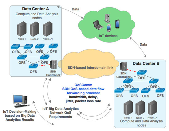Our proposal, QoSComm, provides network QoS for IoT Big Data Analytics, specifically in their job submission process without the need to modify the application and network controller schedulers. QoSComm improves BDA completion time when transferring data flows among SDN-based distributed data centers, as was shown in experiment results described in the previous section.