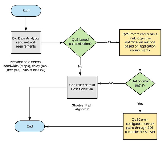 In our model, before submitting a job to compute nodes, in that instant time, QoSComm gets network parameters querying to the SDN controller of each data center and the mathematical process calculates the feasible paths, according to application requirements. In the case of not finding a feasible path, QoSComm requires the SDN controller to forward the data flow using its default method. This process is shown in Figure 2.