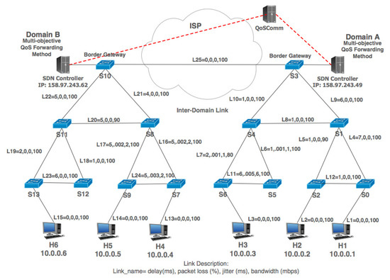 Figure 4 shows the topology used by the simulation model. It is based on three layers, where two data centers defined as Domain A and Domain B are connected. Each domain has its SDN network controller, and they do not communicate with each other. The domains A and B are connected by a link; this could be the case of the Internet Service Provider (ISP) and the bandwidth, delay, packet loss, and jitter link values will be simulated. QoSComm gets the feasible paths based on the application requirements and configures them through each domain SDN controller. Since QoSComm does not require SDN controllers to communicate with each other, there is no need to modify the SDN controller, which is one of the main QoSComm contributions.