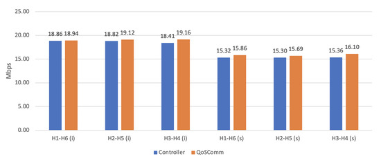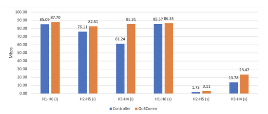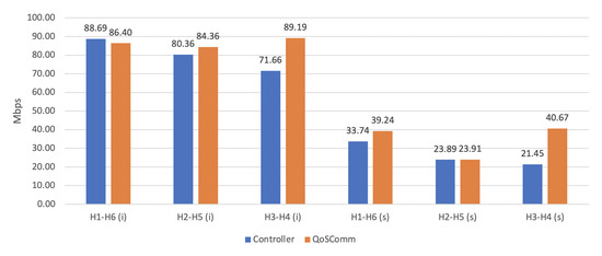 Figure 5 and Figure 6 show IPERF UDP and TCP average results in two sets: individually (i) and simultaneously (s) tests. As it is observed in Figure 5, only in H1 to H6 individual tests was Controller data transfer rate higher than QoSComm, and this is because Controller had a higher bandwidth capacity path (100 mbps) compared to QoSComm selected path (90 mbps). For network stress testing running host-to-host simultaneously transfers, QoSComm obtained a higher data transfer rate compared to Controller improving application data transfer performance.