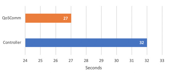 The results showed that the MPI application completion time got benefits using QoSComm data flow forwarding strategy rather than Controller default, as is observed in Figure 8. As mentioned above, QoSComm used Path (S0, S2, S1, S3, S10, S11, S13) and has 11 ms end-to-end delay and 90 mbps of max bandwidth capacity; it took an average of 27 s to complete application jobs. Controller default used Path (S0, S1, S3, S10, S11, S13), which has a 20 ms delay and 100 mbps of maximum bandwidth capacity, and took an average of 32 s to complete. We can see a difference of 5 s using QoSComm instead of Controller default data flow forwarding method.