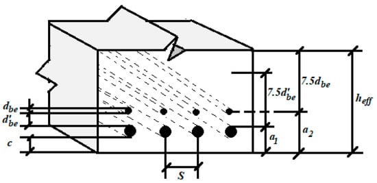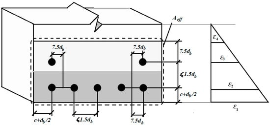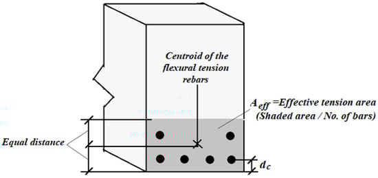 where c, s, b, and are the reinforcement cover (mm), outer rebar’s layer distance (mm), cross-section width (mm), rebar diameter (mm) and outer area of the tension rebar’s layer (mm2), respectively. Furthermore, refers to the participation rate and boundary condition coefficients for rebars, which are considered equal to 0.4 and 0.8 for smooth and conventional rebars, respectively; is the strain coefficient, which is equal to , where and are the highest and lowest effective strains in the tensioned area, respectively. Moreover, is the effective tensioned depth (mm) and is considered equal to the largest amount of either or . Furthermore, it should not be much larger than the tensioned area or half the height of the section, according to CSA S474 [53]. Furthermore, it should not be much larger than the area of the tension or half the thickness as shown in Figure 1.