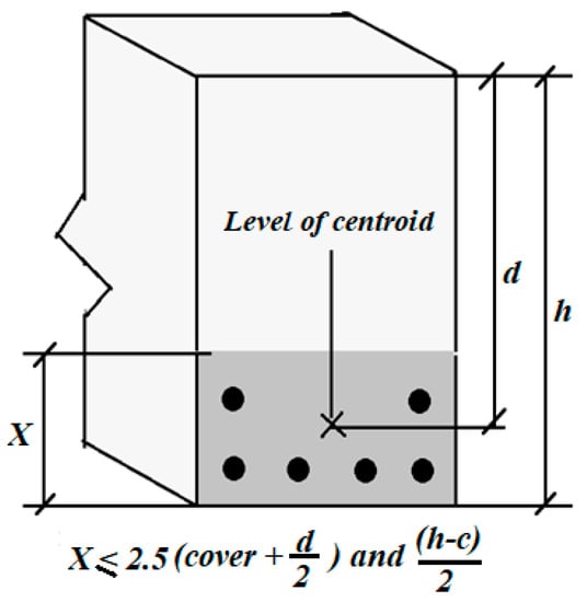where is the maximum crack spacing (mm), is the steel rebar’s stress (MPa), is the cover of the outer tensile rebar’s layer (mm) and A the symmetrical concrete’s cross-sectional area (mm2). is a ratio equal to 1.2 times the space between the horizontal axis and the concrete’s outer tensile layer divided by the distance between the horizontal axis and the longitudinal rebars in the RC beam, as shown in Figure 4.