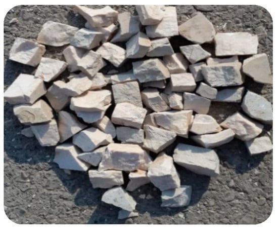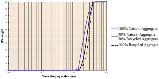 The NCA was characterised according to the Chaboki et al. investigation [58]. In this research, RCA and NCA were used in specimens. The RCA came from demolished buildings and RCA was incorporated at 0%, 50% and 100% by weight. The used NCA and RCA are demonstrated in Figure 5 and Figure 6, correspondingly. Additionally, the grading graph of the aggregates is demonstrated in Figure 7. The characteristics of the aggregates were determined and are shown in Table 1.