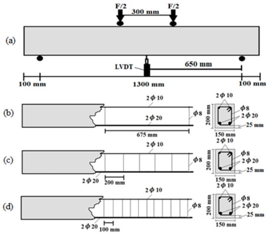 Geometry of the beams and arrangement of the rebars: (a) boundary condition, (b) specimen without transverse reinforcement, (c) specimens with a 200 mm transverse reinforcement spacing and (d) specimens with a 100 mm transverse reinforcement spacing. (Note: LVDT: Linear variable differential transformer).