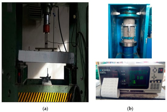 Test setup: (a) four-point bending test of the beams and the (b) compressive stress–strain setup.
