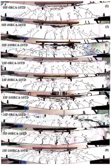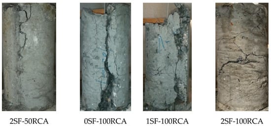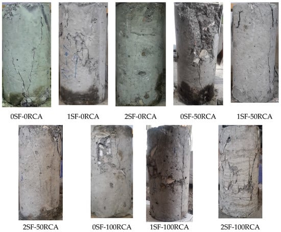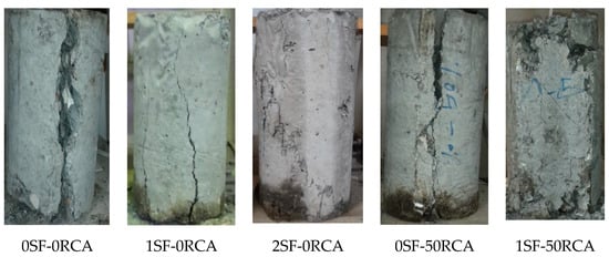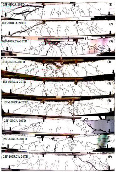 Since the compression and tension strengths of concrete determine the bending performance of concrete beams and their cracking, the impact of the SF and RCA contents on the concrete compression capability was studied. The results are represented in Figure 11. According to this figure, the cracking occurred only in the concrete surface when SFs were added and the specimen did not collapse, which became more perceptible when 2% SFs were added. The lack of concrete tensile strength led to collapsing of the specimen and the cores of the specimens were broken. Hence, by adding SFs, a resistant core of concrete specimens prevented it from collapse, and only the specimens’ surface was cracked and detached. This issue resulted from the bridging role of SFs that kept the particles close together and increased the tensile strength of the concrete. Alternatively, due to RCA’s higher and more angled specific surface compared to NCA, they were better impregnated with cement paste, which prevented the complete disintegration of the sample. Hence, the incorporation both SFs and RCA increased the adhesion between the cement paste and the aggregates and fibres. Therefore, more force was needed to separate the particles from each other and break than the unreinforced concrete, which improved the behaviour of the concrete.