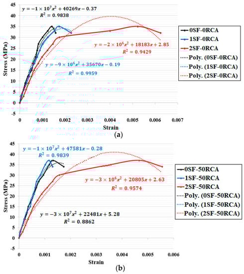 To evaluate the compressive and tensile behaviour of the unreinforced concrete in detail, the stress–strain performance of the specimens produced using different RCA and SF contents were studied. Figure 13 shows the stress–strain curves of the tested specimens.