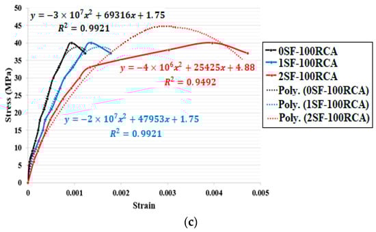 Stress–strain curves of the specimens (a) with no RCA, (b) 50% RCA and (c) 100% RCA.