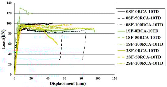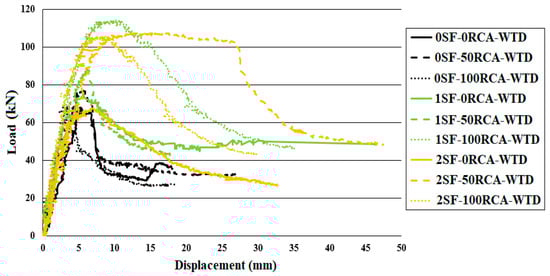 After evaluating the influence of SFs and RCA on the compressive and tensile behaviour of unreinforced concrete, 27 SF-reinforced RCARC beams were produced and measured, where the results are presented in this section. SFs were used at 0%, 1% and 2% (by volume). RCA was incorporated at 0%, 50% and 100% by weight. Furthermore, the effect of shear rebars was considered via different stirrup spacings. The load–displacement behaviour at the mid-span of the specimens, the maximum load-bearing capability and the crack widths and propagation were studied. In Figure 14, Figure 15, Figure 16, Figure 17, Figure 18 and Figure 19, the loading capacity and load-displacement behaviour of the specimens are represented.