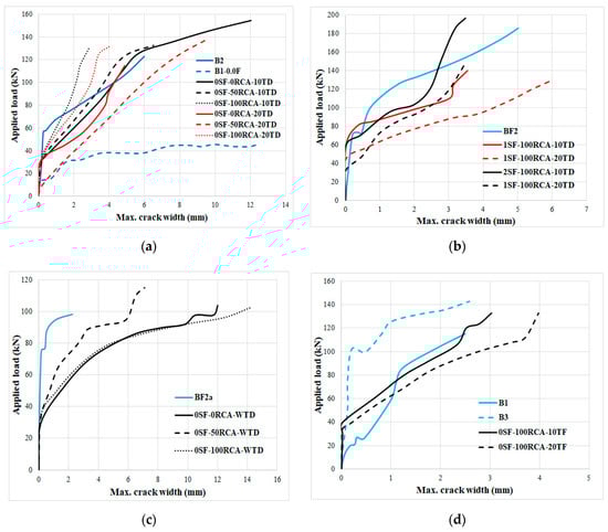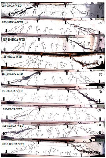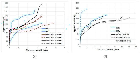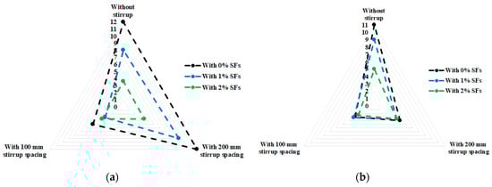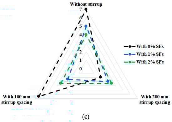 To study the effect of RCA and SF contents as a function of the shear rebars’ spacing, the crack spacing at the peak loads are presented in Table 5 and Figure 20. In Figure 20, the enclosed area of the polygons indicates the influence of the variables on the crack spacing. This means that a reduction of the enclosed area shows a reduction of the crack widths and the positive influence of SFs. Furthermore, in Table 5, the corresponding cracking loads are shown. According to Table 5, using SFs resulted in a considerably decreased crack width at the peak load. Contrariwise, using RCA with more broken surfaces led to a better aggregate bond with cement than using NCA. Therefore, this resulted in reducing the crack widths and increasing the flexural capacity. Providing enough shear rebars along the specimens’ length was essential, especially in specimens with shear cracks, but using SFs could dramatically control the effect of the lack of shear rebars in terms of a reduction in the crack widths. Regarding Figure 20, SFs had a substantial impact on reducing the crack widths at the peak load but there was no significant difference when 1% and 2% SFs were used (Figure 20). Alternatively, using 1% SFs did not have an extensive impact on reducing the crack widths when 100% RCA was used (Figure 20c), but using 2% SFs improved the crack widths in all specimens. According to Figure 20, using 2% SFs significantly reduced the crack widths at the peak load, in contrast to using 1% SFs. Conversely, increasing the RCA content reduced the ultimate crack width reduction effect of SFs.