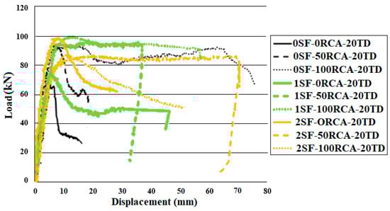 Bending behaviour of specimens with various SF and RA contents and 200 mm shear rebars’ spacing. 20TD: transverse reinforcement spacing 200 mm.